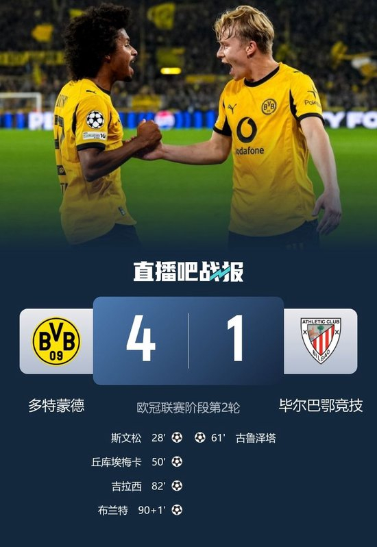 直播吧10月2日讯 北京时间10月2日03:00,欧冠联赛阶段第二轮多特迎战毕尔巴鄂的比赛在伊杜纳信号公园球场进行,上半场阿德耶米助攻斯文松推射破门首开记录,下半场吉拉西助攻丘库埃梅卡低射扩大比分,聚勒解围失误,古鲁泽塔抽射扳回一城,吉拉西建功,布兰特替补建功,最终多特4-1毕尔巴鄂取欧冠首胜。
