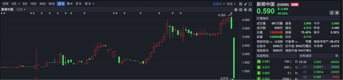 此外,又见公司股价暴跌。今日早间,新明中国(02699.HK)下跌超80%,股价最低报0.51港元,大跌之后该公司市值已低于6000万港元。9月30日,公司公布中期业绩亏损1.37亿元,上年同期亏3.35亿元。