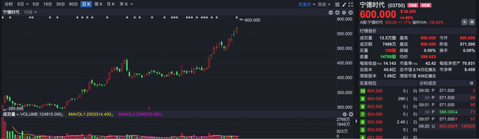 焦点公司方面,宁德时代(03750.HK)早间高开近5%,股价突破600港元大关。而在本周二,宁德时代A股报收于402元人民币,截至今日开盘,宁德时代H股较A股溢价幅度达36.63%。