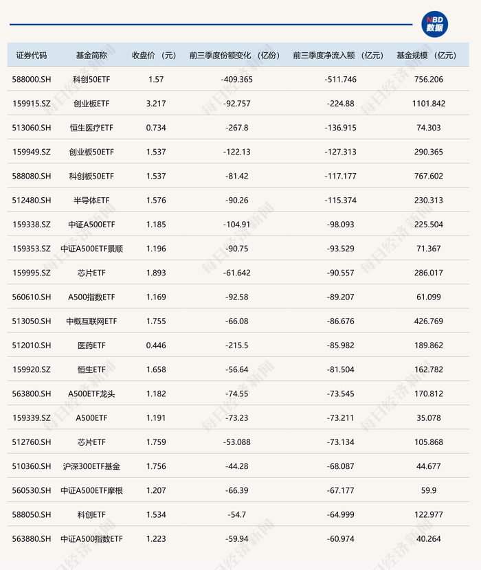 科创50ETF前三季度份额减少了409.37亿份,净流出资金511.75亿元。创业板ETF紧随其后,份额减少92.76亿份,净流出资金224.88亿元。
