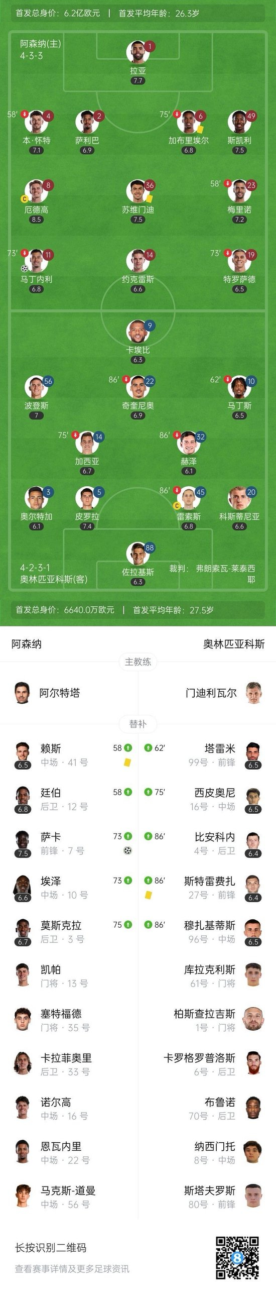 全场比赛结束,阿森纳2-0奥林匹亚科斯。