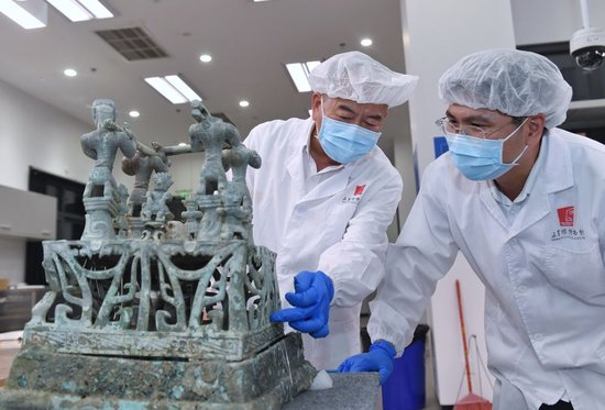 2023年5月30日,在四川三星堆博物馆文物保护和修复中心,文物修复师郭汉中(左)与同事讨论神坛底座修复方案。郭汉中从事文物修复工作已40余年,深度参与了三星堆祭祀坑的发掘工作,累计修复文物6000余件。“大概还有上万件文物等着修复,需要一代接着一代往下干。”郭汉中说,他要把平生所学传承下去,培养更多人才。
