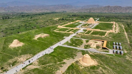 2025年7月10日,游客在宁夏银川西夏陵景区3号陵参观(无人机照片)。西夏陵是西夏留存至今规模最大、等级最高、保存完整的考古遗存,直接为中国历史上延续近200年的西夏王朝及其君主世系提供不可替代的见证作用,实证了西夏王朝在丝绸之路上的中继枢纽地位。西夏陵真实、完整地保存至今,为中华文明多元一体格局和统一的多民族国家形成过程提供了重要见证。2025年7月11日,西夏陵被列入《世界遗产名录》。
