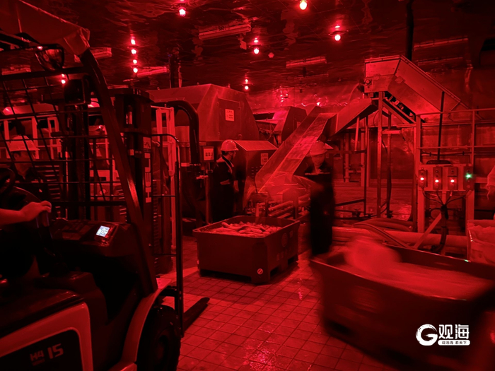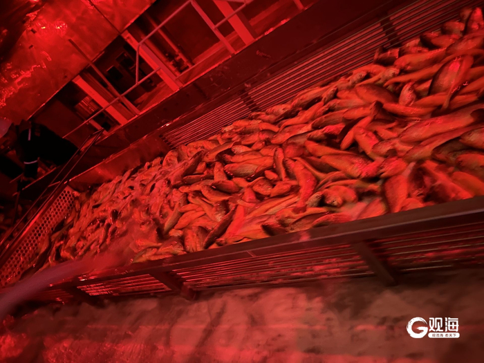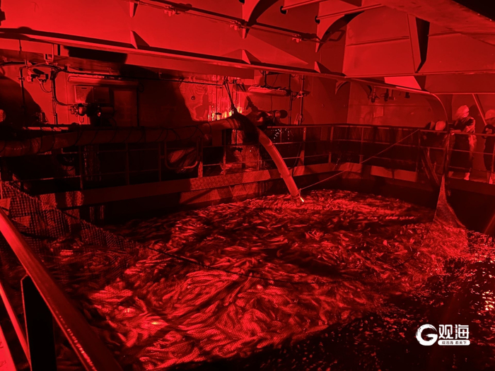 “国信1号2-1”是全球首艘10万吨级养殖工船“国信1号”的升级版。在养殖工船内部,15个标准养殖舱整齐排列,舱内模拟海洋洋流,形成适合鱼类游动的旋转流场,养殖的大黄鱼在其中随流游动。“开始收鱼!”10月4日,伴随着一声号令,工船养殖的3万斤大黄鱼开始陆续起水。通过吸鱼泵和输鱼管道,养殖舱内游动的大黄鱼被转运至休眠池,快速降温休眠锁鲜。休眠锁鲜后的大黄鱼通过提升机装入带有冰浆的保温周转桶中,加盖封箱后,随物流船运输至岸基加工厂,进行销售。