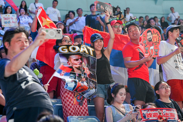 2025年10月3日,上海,久事体育场馆旗忠网球中心,观众席上德约科维奇的球迷举着他的相关物料加油。澎湃新闻记者 朱伟辉 图