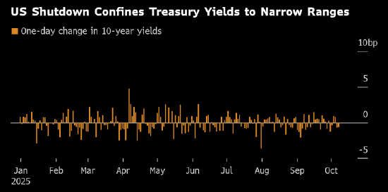 自上周美国联邦政府停摆以来,美国国债的预期波动性大幅下降,因为政府关门在美联储今年剩余两次会议之前的这个关键时点导致至关重要的官方就业数据与通胀报告延迟。数周之后美联储就将举行下一次会议,并将于10月29日作出利率决策。