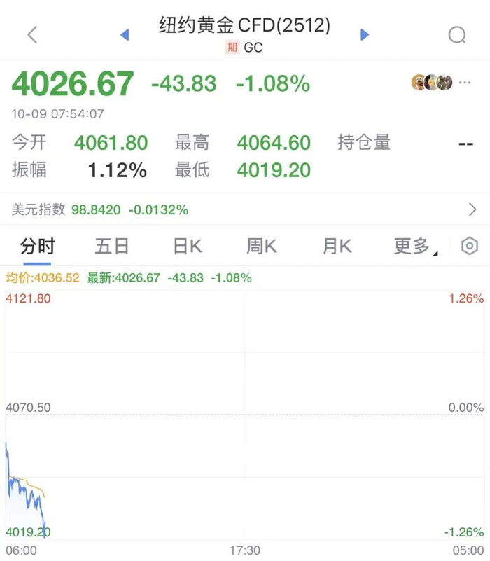 10月9日,国际金价直线跳水。现货黄金一度从4040美元上方跌至4001美元;纽约黄金期货瞬间跌超1%。