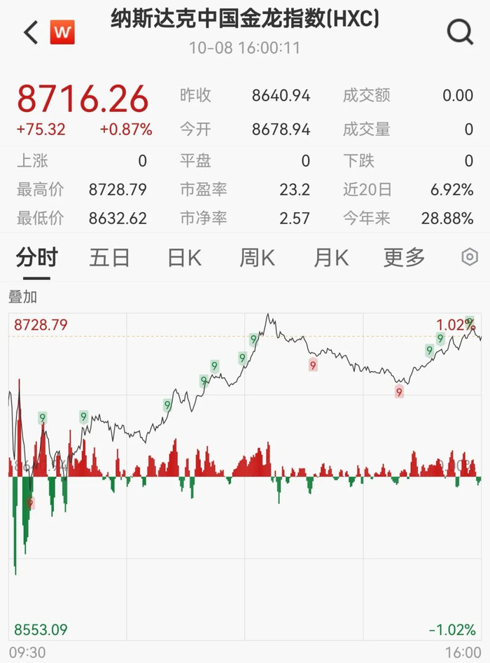 中概股多数上涨,纳斯达克中国金龙指数涨0.87%,万得中概科技龙头指数涨0.56%。