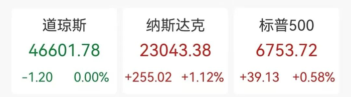 美国三大股指多数收涨,道指持平,报46601.78点;标普500指数涨0.58%,报6753.72点;纳指涨1.12%,报23043.38点。其中,标普500指数、纳指创收盘新高。