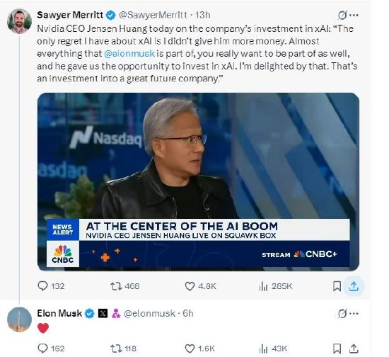 黄仁勋在说到马斯克和他的人工智能初创公司时说:“我对他们正在做的融资机会感到非常兴奋。你知道,我对xAI唯一的遗憾,我们已经是投资者了,我唯一的遗憾是我没有给他更多的钱。”