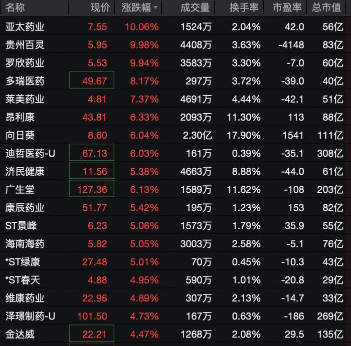 制药板块强势拉升,亚太药业、贵州百灵、罗欣药业直线拉升涨停。