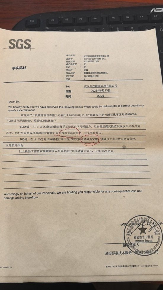 2025年8月,武汉开投能源打开了存货地的两个罐,一个罐是空的,一个罐是水。既然付款方、通道方等几家都没验过货,看到的仅是《新疆巴州天源石油化工有限公司沥青入库统计表》 ,那么这15000吨沥青,是真实存在过(真实发过货)?还是单纯写在合同上的数字?就此问题,10月16日,上游新闻记者联系上新疆天路公司和天源油库法定代表人徐某,对方说:“我不负责这个事,我不知道。”当被问及是不是徐某涛负责时,徐某说“嗯”。
