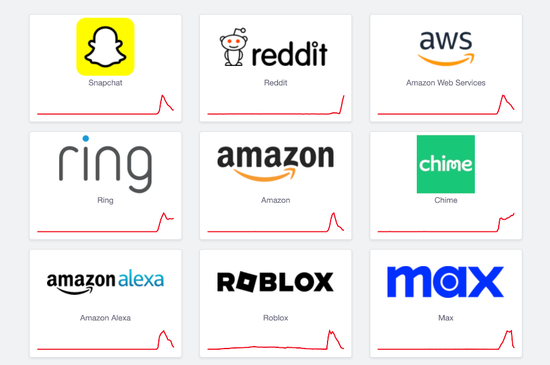 此次宕机波及Snapchat、Robinhood股票交易平台、加密货币平台Coinbase、等大量依赖AWS的互联网平台。图/Downdetector