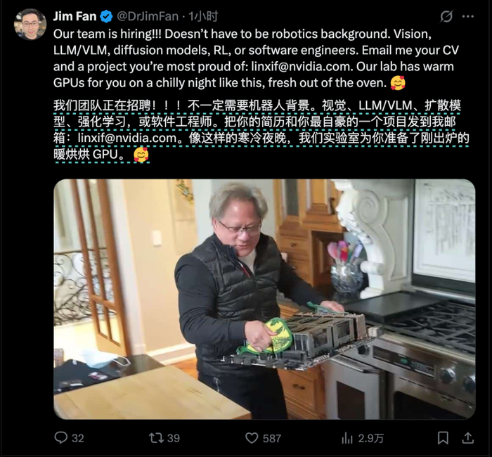 英伟达高级AI研究科学家范麟熙公开发帖称,其所在团队正开展招聘工作,还特别提及“在这样的‘寒冬’里,我们实验室已为大家准备好‘热乎乎’的高性能GPU”。这种以算力资源为诱饵的招聘策略,反映出当前AI人才竞争已进入白热化阶段。