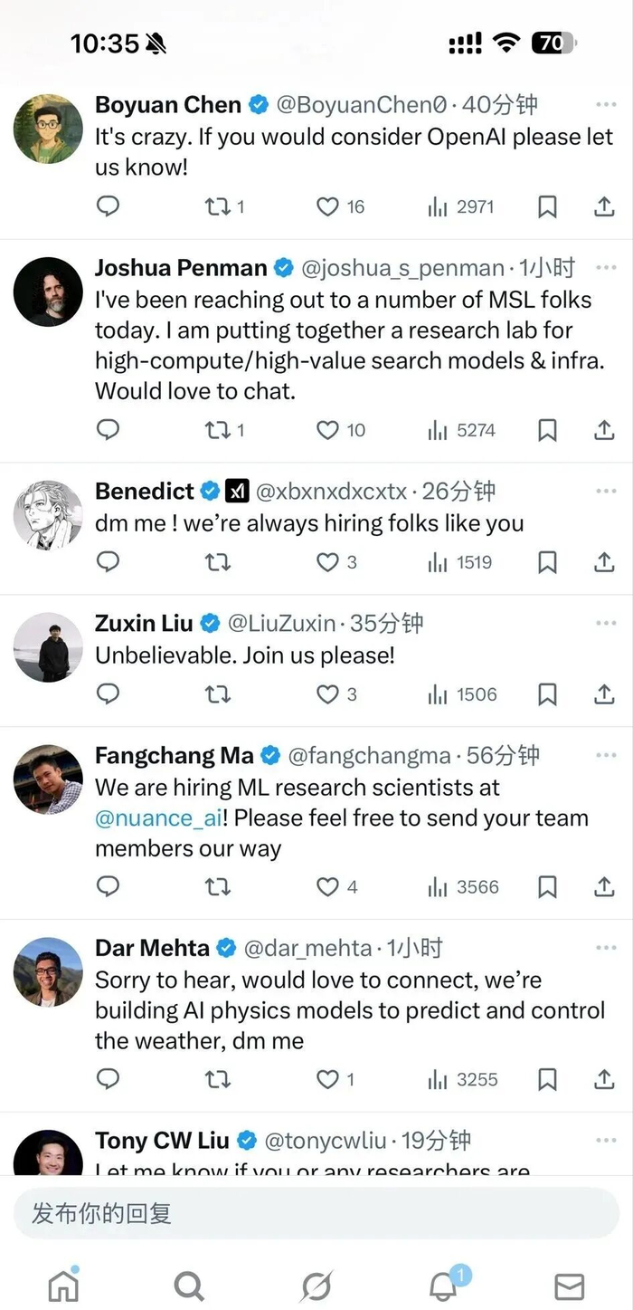 在田渊栋宣布离职的帖子下,OpenAI、XAI、Anthropic等头部AI公司纷纷抛出橄榄枝。这种公开“抢人”现象,在传统的科技行业裁员中并不常见,凸显了顶尖AI研究人员的稀缺性和价值。