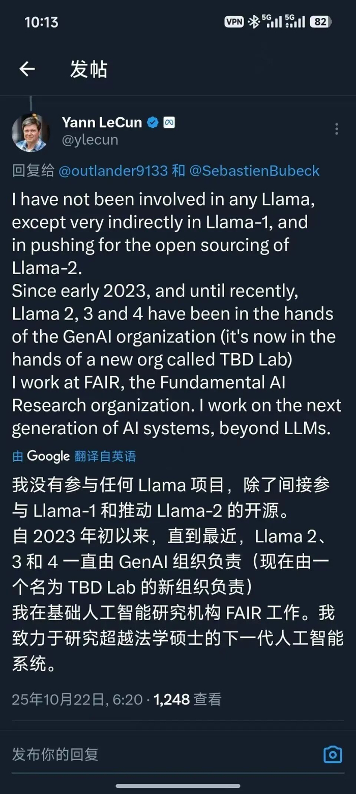 与此同时,Meta首席AI科学家杨立昆在裁员当天秀出与吴恩达的合照,并发表声明与Llama 4项目切割。他强调,除了间接参与Llama-1的开源推广,自2023年初以来,Llama 2、3和4一直由TBD实验室负责。这一表态被业界解读为Meta内部研究方向的重大调整。