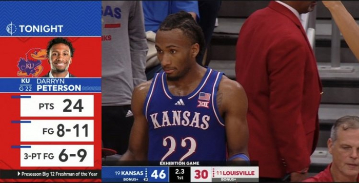 明年状元热门、堪萨斯大学球员达林-彼得森表现出色,他上半场11中8(三分9中6),轰下24分。全场比赛他得到26分4篮板2助攻。