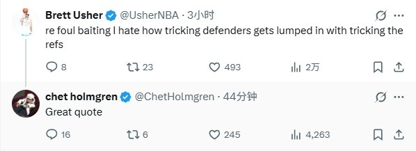直播吧10月26日讯 今天,雷霆球员霍姆格伦在推特上点赞了一则关于造犯规的评论。