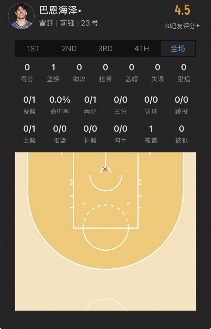雷霆44号秀 布鲁克斯-巴恩海泽 登场10.8分钟