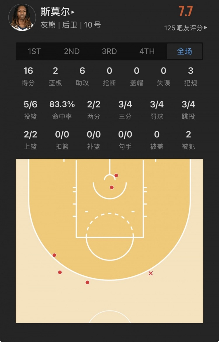 灰熊48号秀 贾冯-斯莫尔 登场20.8分钟