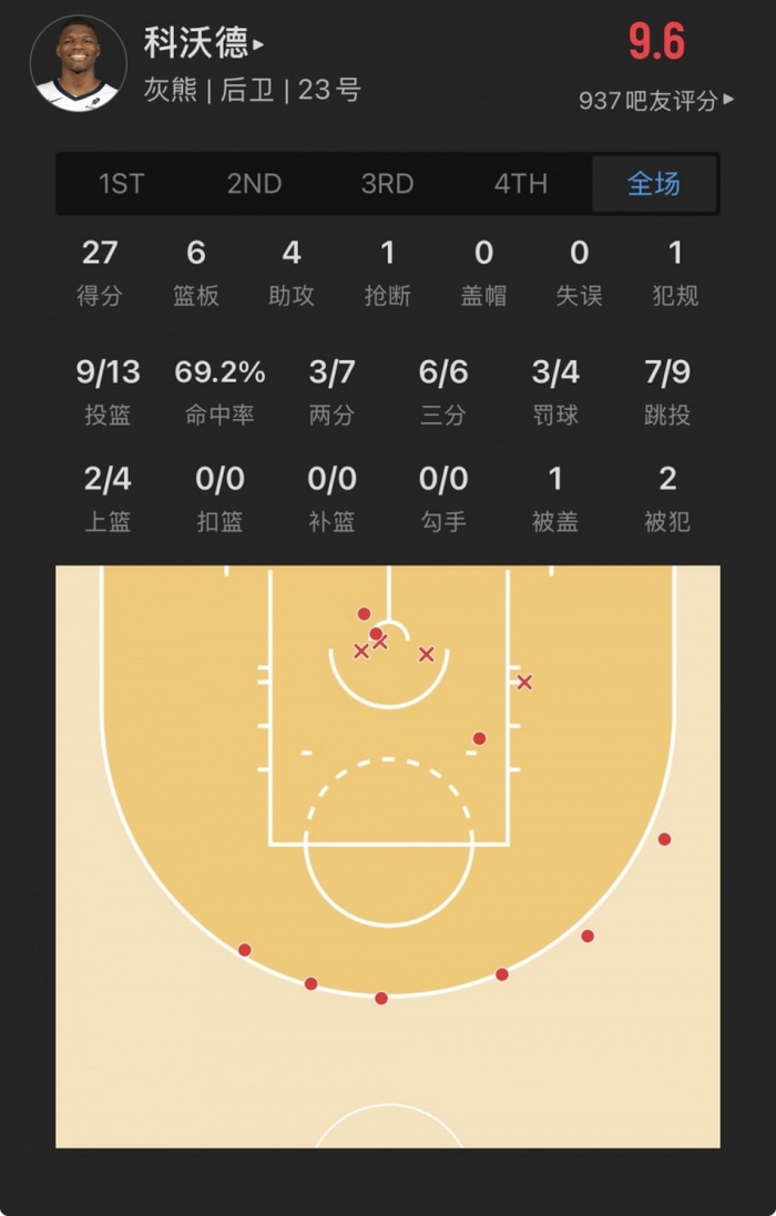 灰熊11号秀 锡德里克-科沃德 登场23.7分钟