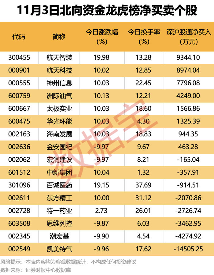 今日龙虎榜现身个股中,8股获北向资金净买入。净买入居首的是航天智装,金额为9344.1万元;航天科技、神州信息获净买入均超7700万元。