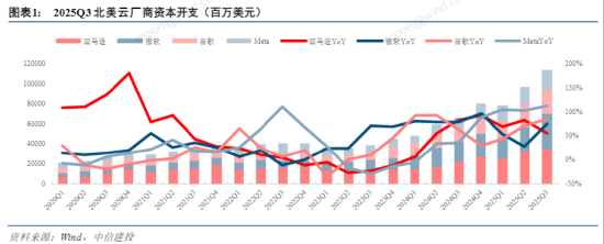 截至上周,美股Mag7除英伟达外均已发布Q3财报,各家云厂商资本开支的增长及指引仍非常积极。据中信建投统计,四大CSP的Q3资本开支达到1133亿美元,同比增长75%,环比增长18%。(提及具体公司仅为说明行业观点,不构成投资建议,下同)