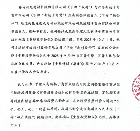 不过,前述重整方案公示之后,10月15日,杉杉集团重整案中,参选联合体的原投资者之一——赛迈科先进材料股份有限公司(以下简称赛迈科)突然向宁波市鄞州区人民法院和破产管理人等递交申请,希望延迟召开10月21日的债权人大会。