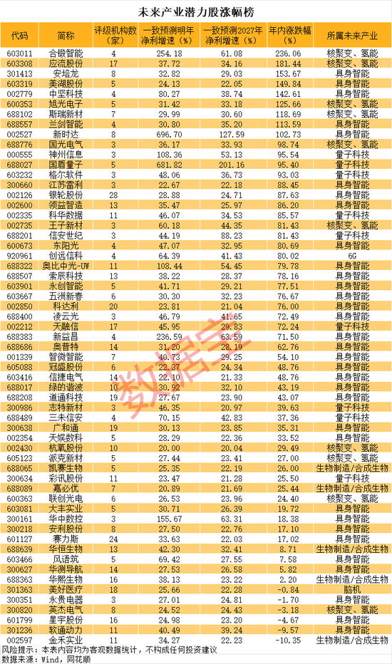 部分公司的成长性值得期待。据数据宝统计,3家及以上机构评级个股中,有59只个股一致预测明年及2027年净利增速均超20%。其中国盾量子、新时达两只个股未来两年机构一致预测净利增速均超100%,合锻智能、神州信息、华中数控等个股净利增速均超50%。