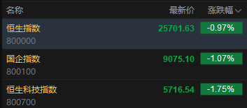 今日港股三大指数集体低开,恒生指数跌0.97%,报25701.63点,恒生科指跌1.75%,国企指数跌1.07%。盘面上,科网股集体下跌,哔哩哔哩、快手跌超2%,小米、百度、阿里巴巴、联想、腾讯、京东、美团、网易跌超1%;黄金股继续下跌,紫金黄金国际跌超3%;汽车股走弱,赛力斯上市首日跌近2%;锂电池板块多数下跌,赣锋锂业跌超4%。