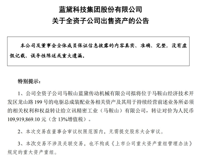 蓝黛科技在公告中表示,公司全资子公司马鞍山蓝黛传动机械有限公司拟将位于马鞍山经济技术开发区龙山路199号的电驱总成装配业务相关资产及其用于持续经营前述业务所必须的相关权利和权益转让给立讯精密工业(马鞍山)有限公司,转让对价为1.099亿元(含 13%增值税)。