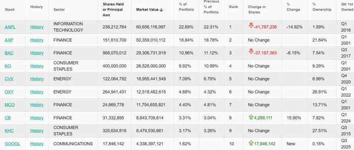 文件显示,伯克希尔三季度减持苹果约4179万股,持股数较二季度末环比减少逾14.9%,持仓市值减少约106亿美元。这是伯克希尔连续第二个季度抛售苹果,尽管如此,到三季度末,伯克希尔还持有苹果逾2.38亿股,苹果仍是头号重仓股。三季度新进Alphabet约1785万股,这是伯克希尔首次建仓谷歌母公司,这些Alphabet股份市值约43.4亿美元,在伯克希尔持仓中占1.62%。到三季度末,以持仓市值计,伯克希尔的十大重仓股大多数都是“老面孔”,唯一的新面孔就是Alphabet,它挤掉了二季度排名第十的肾脏透析服务商德维特(DVA),后者三季度退居第11位。
