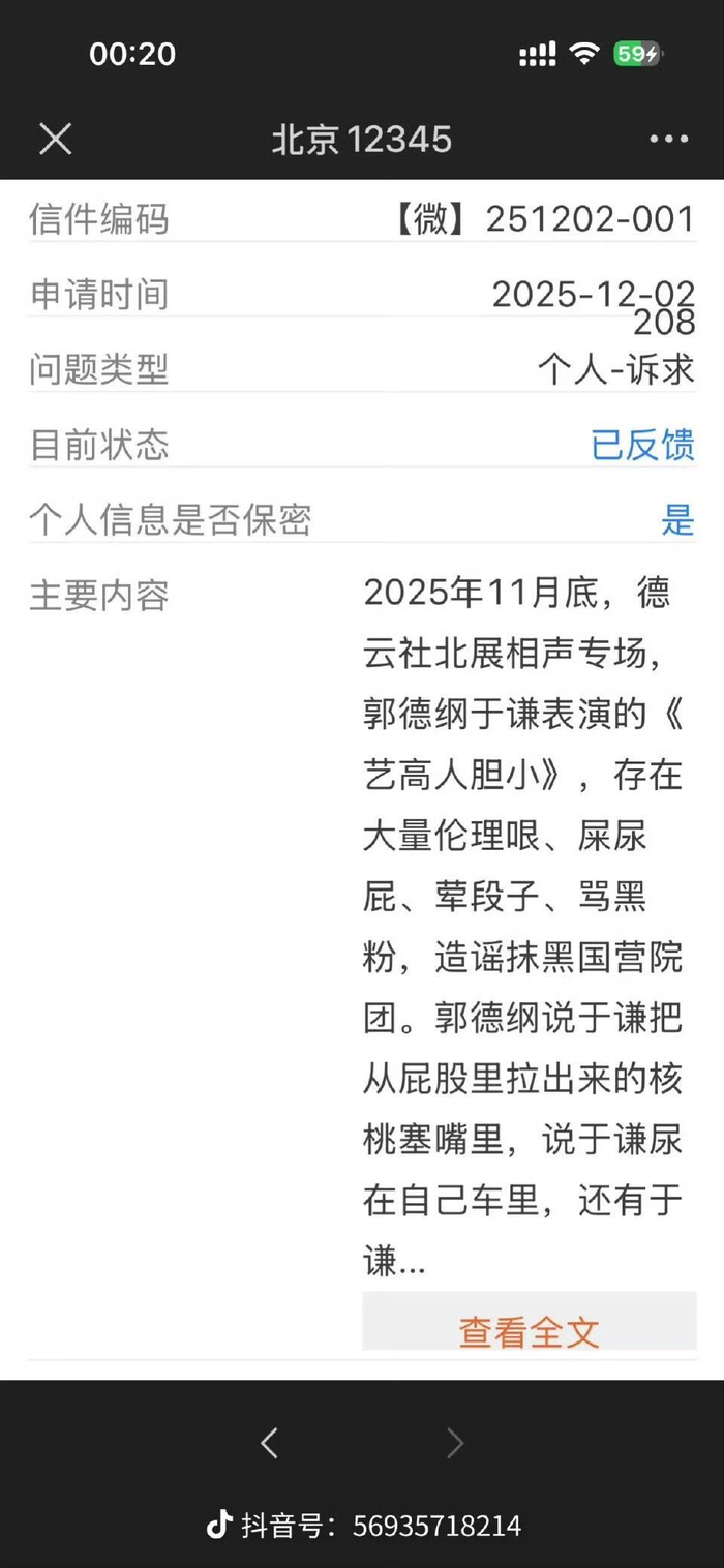 此外,网络上还有两张截图流传甚广。一张为网友12月2日提交给北京12345的投诉截图,图中投诉内容为:“2025年11月底,德云社北展相声专场,郭德纲于谦表演的《艺高人胆小》,存在大量伦理哏、屎尿屁、荤段子、骂黑粉,造谣抹黑国营院团(等台词)。”