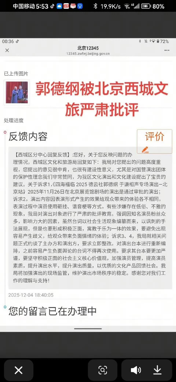 另一张开头标注为“西城区分中心回复反馈”的北京12345回复系统截图被网友贴上了“郭德纲被北京西城文旅严肃批评”的红字。图片显示,回复反馈于12月4日发送,其反馈内容包括:“表演过程中演员使用砸挂、谐音梗等方式,有些涉嫌存在低俗、不雅的现象,我局对演出对象进行了严肃的批评教育。”