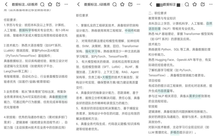 早期招聘要求的学历水平大多在专科、高中,无需经验、上手就能做。但今年,候选人本科以上学历的占比超过五成。通用类AI标注开始有经验要求;垂直类一般要求相关专业或行业经验,部分岗位需要做专业笔试。