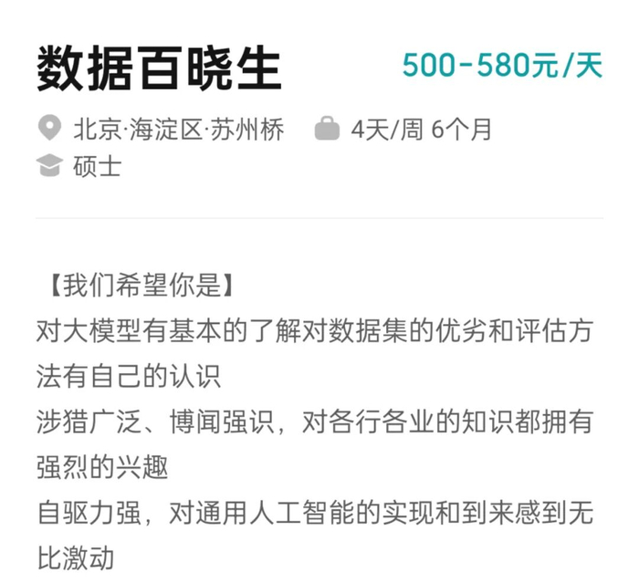 2023年起,DeepSeek开始招聘“数据百晓生”岗位,不限专业、不限经验,实习生日薪超过500元,正职年薪可达百万。岗位要求之一是“涉猎广泛、博闻强识,对各行各业的知识都拥有强烈的兴趣”。