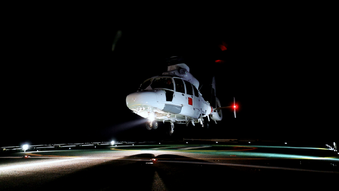 踏浪着舰!南海某海域 海警直升机展开夜间高强度着舰训练