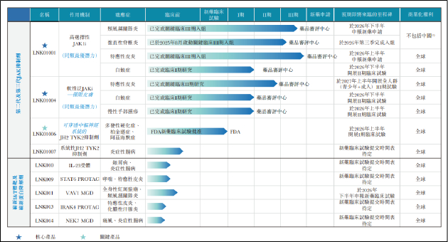 业务方面,公司核心候选产品包括第二代JAK1抑制剂LNK01001及第三代软性泛JAK抑制剂LNK01004。其中LNK01001为公司距离商业化最近的管线,目前正进行多项III期临床试验并预计于2026年上半年、2026年下半年及2027年下半年进入特应性皮炎、类风湿关节炎及强直性脊椎炎的新药申请阶段。
