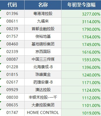 粤港湾控股、九福来涨超30倍