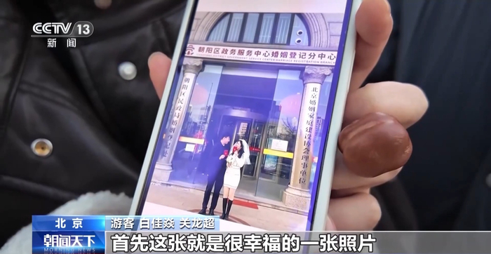 游客 白佳焱 、关龙超:这张领结婚证的照片吧。首先这张是很幸福的一张照片,另外它也代表了我们的便利。因为之前都是要回老家去登记的,现在可以在北京,周末就可以去登记,几分钟就领好了。