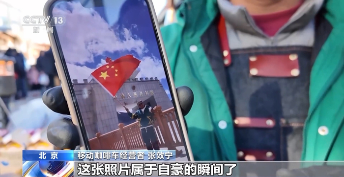 移动咖啡车经营者 张效宁:我前段时间去新疆旅行了一趟。不出去不知道祖国有多大、有多美好。而且和我媳妇在一起很幸福,幸福具象化了。我是从伊犁伊宁出发的,然后到了我们祖国的国门,在那边拍了照片。这张照片属于自豪的瞬间,是在红其拉甫国门照的,在5100米海拔的高度上,带上了国旗,带上了我的咖啡。所以这个照片就是我想表达的,一手是国旗,一手是我们的生活。这个是幸福的瞬间,是自豪的瞬间。在这么偏远的地方,能有着这么一群人守护着祖国的西大门,人民安居乐业,是多么不容易的一件事情。强大的国家,给了我们底气。