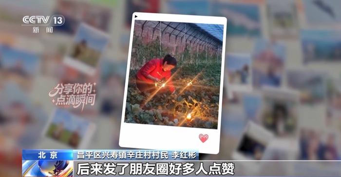 昌平区兴寿镇辛庄村村民 李红彬:我爱人,挺温馨吧,那是傍晚时拍的烛光草莓,点的蜡烛,诚心要的拍照效果,后来发了朋友圈好多人点赞。种大棚辛苦是辛苦,但是看到每年成熟的果实之后,心里就舒服了。种大棚草莓有苗补、种菜有菜补,每年都有补贴,挺好。