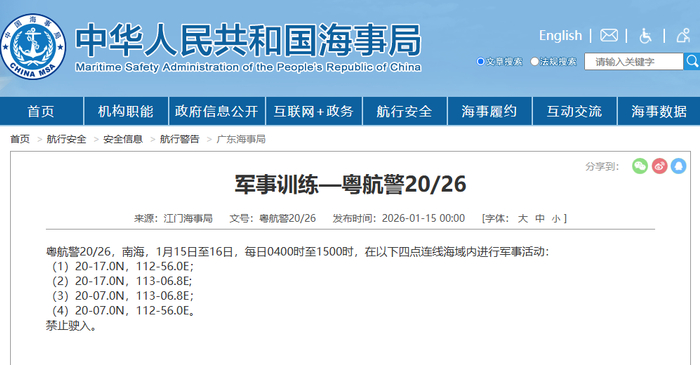 央视网消息:据中国海事局网站消息,江门海事局发布航行警告,1月15日至16日,每日4时至15时,南海部分海域进行军事活动,禁止驶入。