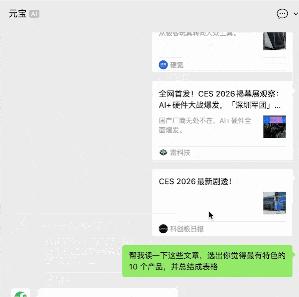 *2025年4月元宝上线微信。刚好最近我在关注CES,把链接丢给元宝,它很快就整理出一份特色产品“榜单”。