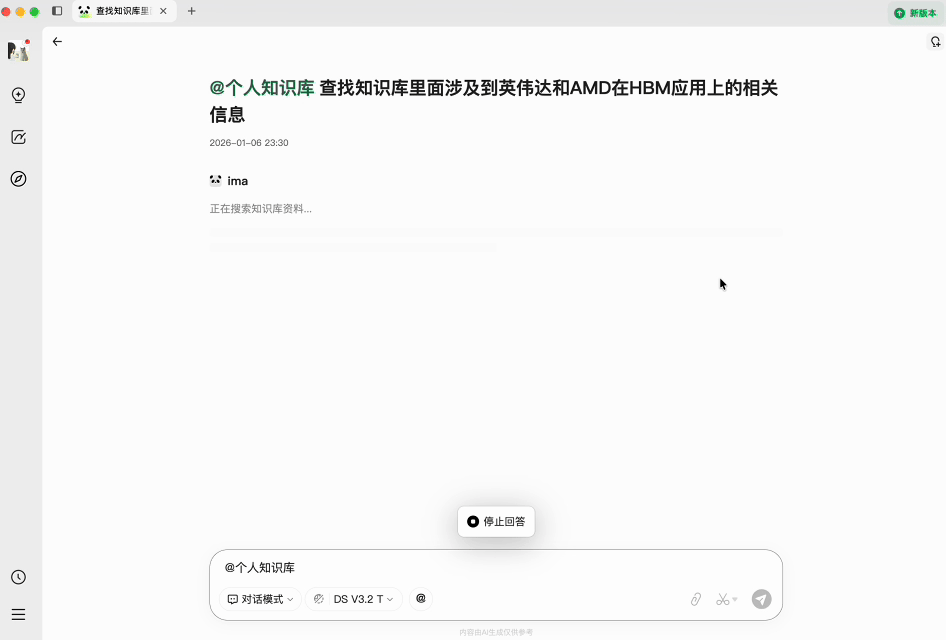 DeepResearch 出的结果可以一键导出成 PDF 存下来,连同一些关键的网页整理存放在 IMA 上。要用的时候不再需要我手动查找,直接在 IMA 里@个人知识库,输入要查询的关键词,就能找到相关内容并进行总结。