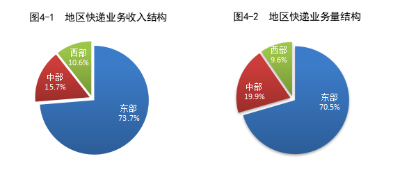 2025年,东、中、西部地区快递业务收入比重分别为73.7%、15.7%和10.6%,快递业务量比重分别为70.5%、19.9%和9.6%。与去年同期相比,东部地区快递业务收入比重下降1.1个百分点,快递业务量比重下降1.9个百分点;中部地区快递业务收入比重上升0.8个百分点,快递业务量比重上升1.2个百分点;西部地区快递业务收入比重上升0.3个百分点,快递业务量比重上升0.7个百分点。