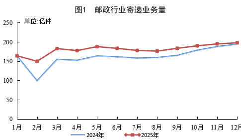 其中,12月份,邮政行业寄递业务量完成197.7亿件,同比增长1.8%。其中,快递业务量完成182.1亿件,同比增长2.3%。