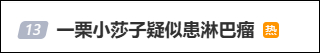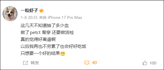 此前,其微博小号“一粒虾子”在回答网友疑问时提到,“疑似淋巴瘤”,并发文显示,已经历骨穿、活检等检查,接下去即将进行化疗。
