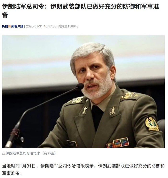 央视新闻报道,当地时间1月31日,伊朗陆军总司令哈塔米表示,伊朗武装部队已做好充分的防御和军事准备。