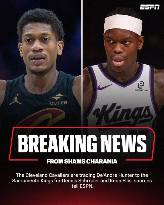 直播吧02月01日讯 据ESPN名记Shams Charania报道,克利夫兰骑士队将把德安德烈·亨特交易至萨克拉门托国王队,以换取丹尼斯·施罗德和基翁·埃利斯。